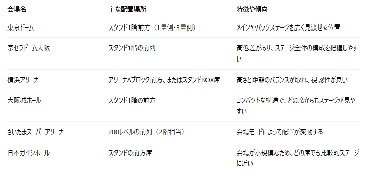 会場によって配置は異なりますが、アリーナの最前列のように極端に近い位置ではなく、ステージ全体を広く見渡せる場所が選ばれる傾向があります。